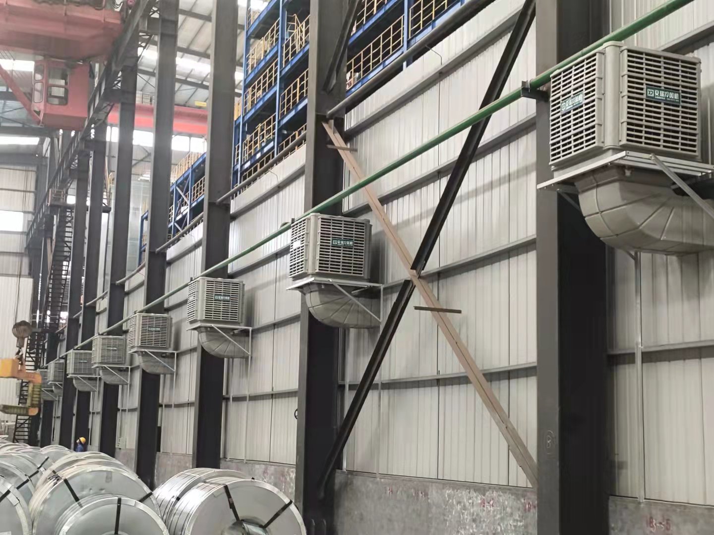 我公司為金泰包裝改造連退新車間通風降溫,連退車間高36米寬18米長200米,整個車間連退設備發熱量大設備多,設備高30米,高處維修平臺正常溫度達到55到60度,極端天氣能達到65度,工人上去幾分鐘就中暑,我公司設計1460型玻璃鋼負壓風機60臺向外排熱氣,在廠房兩次安裝20臺22型濕簾冷風機往車間送大量冷風,設備安裝運行以后車間溫度降到40度左右,極大的改善了工作環境。